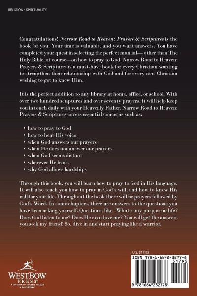 Congratulations! Narrow Road to Heaven: Prayers & Scriptures is the book for you. Your time is valuable, and you want answers. You have completed your quest in selecting the perfect manual- other than The Holy Bible, of course-on how to pray to God. Narrow Road to Heaven: Prayers & Scriptures is a must-have book for every Christian wanting to strengthen their relationship with God and for every non-Christian wishing to get to know Him. It is the perfect addition to any library at home, office, or school. With over two hundred scriptures and over seventy prayers, it will help keep you in touch daily with your Heavenly Father. Narrow Road to Heaven: Prayers & Scriptures covers essential concerns such as: ¿ how to pray to God ¿ how to hear His voice ¿ when God answers our prayers ¿ when He does not answer our prayers ¿ when God seems distant ¿ wherever He leads ¿ why God allows hardships Through this book, you will learn how to pray to God in His language. It will also teach you how to pray in God's will, and how to know His will for your life. Throughout the book there will be prayers followed by God's Word. In some chapters, there are answers to the questions you have been asking yourself. Questions, like, What is my purpose in life? Does God listen to me? Does He even love me? You will get the answers you seek my friend! So, dive in and start praying like a warrior.