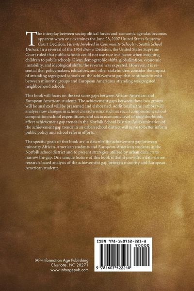 A volume in The Achievement Gap, Research, Practice, and Policy C. Kent McGuire and Vivian W. Ikpa, Series Editors The interplay between sociopolitical forces and economic agendas becomes apparent when one examines the June 28, 2007 United States Supreme Court Decision, Parents Involved In Community Schools v. Seattle School District . In a reversal of the 1954 Brown Decision, the United States Supreme Court ruled that public schools could not use race as a factor when assigning children to public schools. Given demographic shifts, globalization, economic instability, and ideological shifts, the reversal was expected. However, it is essential that policymakers, educators, and other stakeholders consider the impact of attending segregated schools on the achievement gap that continues to exist between minority groups and European Americans attending resegregated neighborhood schools. This book will focus on the test score gaps between African American and European American students. The achievement gaps between these two groups will be analyzed will be presented and elaborated. Additionally, the authors will analyze how changes in school characteristics such as: racial composition; school composition; school expenditures, and socio economic level of neighborhoods affect achievement gap trends in the Norfolk School District. An examination of the achievement gap trends in an urban school district will serve to better inform public policy and school reform efforts. The specific goals of this book are to describe the achievement gap between minority African-American students and European-American students in the Norfolk school district and to present strategies utilized by urban districts to narrow the gap. One unique feature of this book is that it provides a data-driven research-based analysis of the achievement gap between minority and European-American students.