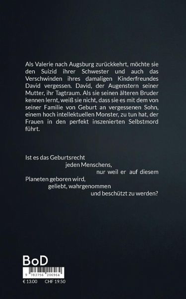 David stammt aus einer vornehmen Familie und seine Mutter ist Richterin in Augsburg. Valerie ist mit…mehrEin Buch, das für mich selbst ein Heimspiel ist, jeder der Orte und Plätze, die in dem Buch beschrieben sind, kann ich mir bildhaft vorstellen, was natürlich dem Ganzen nochmals eine besondere Note gibt. Wie soll ich das Buch beschreiben? Ich würde ihm das Prädikat: Unübertroffen spannend geben. David stammt aus einer vornehmen Familie und seine Mutter ist Richterin in Augsburg. Valerie ist mit David befreundet, was nicht so gerne gesehen wird, da diese aus einer einfachen Familie stammt. Doch dann bei einem Schulausflug im Wald ist der Junge spurlos verschwunden und er wurde nie mehr gefunden, ES wurde aber auch kein Lösegeld gefordert. Sein älterer Bruder Lothar ist ins Internat abgeschoben worden, um ihn hat sich die Familie nie gekümmert, immer nur war der Jüngste der Sonnenschein. Valerie selbst kommt nach Jahren wieder nach Augsburg zurück, sie konnte David nie vergessen. Inzwischen ist sie Ärztin. Sie will sie um ihre betagte Tante kümmern, da sich ihre Schwester das Leben genommen hat, wie es scheint, aus Liebeskummer. In dieser Zeit trifft Valerie auch auf Lothar, der inzwischen Chefarzt im Klinikum ist. Die beiden freunden sich schon aus beruflichen Gründen an. Zur gleichen Zeit merkt die Kripo Augsburg, dass sehr viele Selbstmorde von Frauen begangen worden sind, die sich alle mit einem charismatischem Mann getroffen haben, der sie aber dann im Laufe der Zeit erniedrigt hat. Ist dieser Mann vielleicht ein Serienmörder? Ich habe das Buch regelrecht verschlungen. Die Autorin versteht es gekonnt, aus verschiedenen Perspektiven die Sache zu beleuchten und man ist immer wieder selbst im Zweifel. was eigentlich geschehen ist. Es ist immer wieder ein Wechselspiel der Gefühle, wer ist hier Gut und wer Böse. Und Valerie selbst beginnt wegen dem Tod ihrer Schwester Nachforschungen anzustellen und begibt sich in tödliche Gefahr. Die Sprache und die Ausdrucksform der Autorin ist sehr gut zu verstehen, der Spannungsbogen steigt von Kapitel zu Kapitel, die Ereignisse werden bildlich hervorragend dargeStellt. Dann kommt das Ende. Pompös und grandios. Ein Psychothriller, der total unter die Haut geht und lange, nachdem man das Buch gelesen hat, lassen uns die Geschehnisse nicht los. Das Cover ist dunkel, und voller Gefahren.
