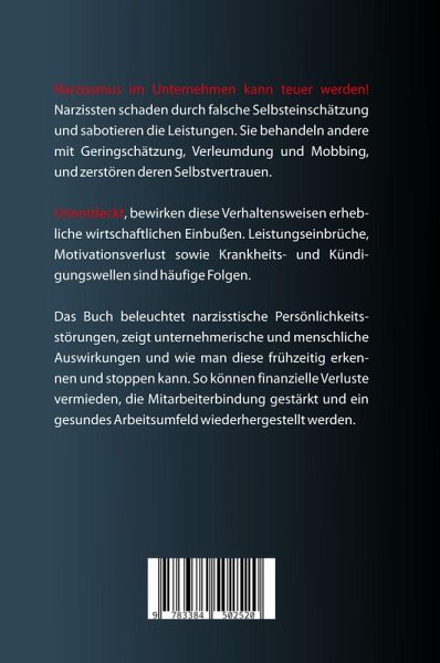 Narzissmus im Unternehmen kann teuer werden! Narzissten schaden durch falsche Selbsteinschätzung und sabotieren die Leistungen. Sie behandeln andere mit Geringschätzung, Verleumdung und Mobbing, und zerstören deren Selbstvertrauen. Unentdeckt, bewirken diese Verhaltensweisen erhebliche wirtschaftlichen Einbußen. Leistungseinbrüche, Motivationsverlust sowie Krankheits- und Kündigungswellen sind häufige Folgen. Das Buch beleuchtet narzisstische Persönlichkeitsstörungen, zeigt unternehmerische und menschliche Auswirkungen und wie man diese frühzeitig erkennen und stoppen kann. So können finanzielle Verluste vermieden, die Mitarbeiterbindung gestärkt und ein gesundes Arbeitsumfeld wiederhergestellt werden.