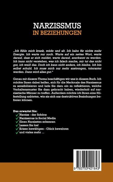 ,,Ich fühle mich krank, müde und alt. Ich habe für nichts mehr Energie. Ich warte nur noch. Warte auf ein nettes Wort, warte darauf, dass er sich meldet, warte darauf, anerkannt zu werden. Ich kann nicht verstehen, was ich falsch mache, mir tut das nicht gut, ich weiß das. Doch ich kann nicht anders, ich bleibe. Ich bin selbst schuld. Ich muss mich nur mehr anstrengen, toleranter werden. Dann wird alles gut.''Genau mit diesem Thema beschäftigen wir uns in diesem Buch. Ich möchte Ihnen dabei helfen, sich für die Merkmale des Narzissmus zu sensibilisieren und lade Sie dazu ein zu reflektieren, welche Verhaltensmuster Sie dazu gebracht haben, wiederholt auf narzisstische Männer zu treffen. Außerdem möchte ich Ihnen eine Hilfestellung anbieten, wie sie sich aus destruktiven Beziehungen befreien können.Das erwartet Sie:-Narziss - der Schöne-Narzissmus in Social Media-Einen Narzissten erkennen-Lassen Sie los!-Krisen bewältigen - Glück bewahren-und vieles mehr ...