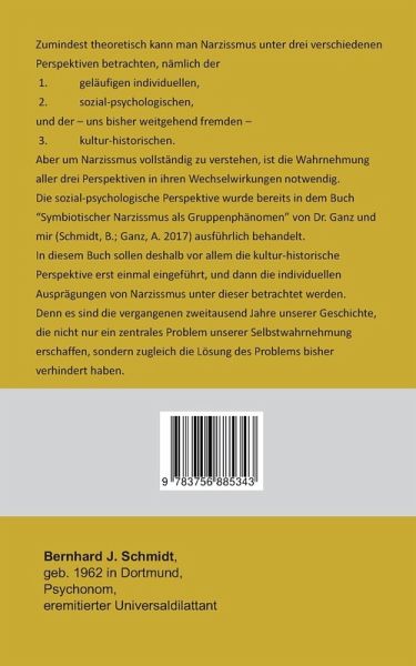 Zumindest theoretisch kann man Narzissmus unter drei verschiedenen Perspektiven betrachten, nämlich der 1. geläufigen individuellen,2. sozial-psychologischen, und der - uns bisher weitgehend fremden - 3. kultur-historischen.Aber um Narzissmus vollständig zu verstehen, ist die Wahrnehmung aller drei Perspektiven in ihren Wechselwirkungen notwendig.Die sozial-psychologische Perspektive wurde bereits in dem Buch "Symbiotischer Narzissmus als Gruppenphänomen" von Dr. Ganz und mir (Schmidt, B.; Ganz, A. 2017) ausführlich behandelt.In diesem Buch sollen deshalb vor allem die kultur-historische Perspektive erst einmal eingeführt, und dann die individuellen Ausprägungen von Narzissmus unter dieser betrachtet werden.Denn es sind die vergangenen zweitausend Jahre unserer Geschichte, die nicht nur ein zentrales Problem unserer Selbstwahrnehmung erschaffen, sondern zugleich die Lösung des Problems bisher verhindert haben.