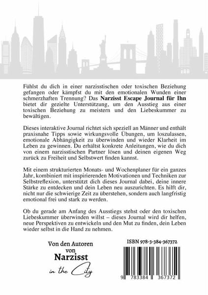 Fühlst du dich in einer narzisstischen oder toxischen Beziehung gefangen oder kämpfst du mit den emotionalen Wunden einer schmerzhaften Trennung? Das Narzisst Escape Journal für Ihn bietet dir gezielte Unterstützung, um den Ausstieg aus einer toxischen Beziehung zu meistern und den Liebeskummer zu bewältigen.Dieses interaktive Journal richtet sich speziell an Männer und enthält praxisnahe Tipps sowie wirkungsvolle Übungen, um loszulassen, emotionale Abhängigkeit zu überwinden und wieder Klarheit im Leben zu gewinnen. Du erhältst konkrete Anleitungen, wie du dich von einer narzisstischen Partnerin lösen und deinen eigenen Weg zurück zu Freiheit und Selbstwert finden kannst.Mit einem strukturierten Monats- und Wochenplaner für ein ganzes Jahr, kombiniert mit inspirierenden Motivationen und Techniken zur Selbstreflexion, unterstützt dich dieses Journal dabei, deine innere Stärke zu entdecken und dein Leben neu auszurichten. Es hilft dir, nicht nur die schwierige Zeit zu überstehen, sondern auch langfristig emotional frei und stark zu werden.Ob du gerade am Anfang des Ausstiegs stehst oder den toxischen Liebeskummer überwinden willst - dieses Journal wird dir helfen, neue Perspektiven zu entwickeln und den Mut zu finden, dein Leben wieder selbst in die Hand zu nehmen.