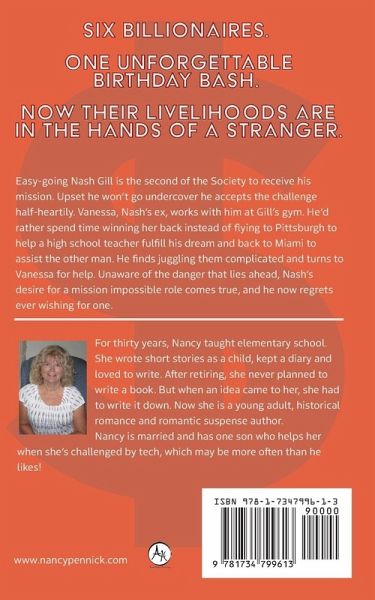 Nash must rise to the challenge to get his fortune back in this captivating romantic suspense series. The Secret Billionaire Society. Six billionaires. One unforgettable birthday bash. Now their livelihoods are in the hands of a stranger. Easy-going Nash Gill is the second of the Society to receive his mission. Upset he won't go undercover like his friend, Chase, he accepts the challenge half-heartily. Vanessa, Nash's ex, works with him at Gill's gym. He'd rather spend time winning her back instead of flying to Pittsburgh to help a high school teacher fulfill his dream and back to hire the other assignment in Miami. Tasked with aiding these two men, he finds juggling them complicated and turns to Vanessa for help. Unaware of the danger which lies ahead, Nash's desire for a mission impossible role comes true, and he now regrets ever wishing for one. This can be read as a standalone. Six billionaires. One unforgettable birthday bash. Now their livelihoods are in the hands of a stranger. Easy-going Nash Gill is the second of the Society to receive his mission. Upset he won't go undercover like his friend, Chase, he accepts the challenge half-heartily. Vanessa, Nash's ex, works with him at Gill's gym. He'd rather spend time winning her back instead of flying to Pittsburgh to help a high school teacher fulfill his dream and back to hire the other assignment in Miami. Tasked with aiding these two men, he finds juggling them complicated and turns to Vanessa for help. Unaware of the danger which lies ahead, Nash's desire for a mission impossible role comes true, and he now regrets ever wishing for one. This can be read as a standalone.