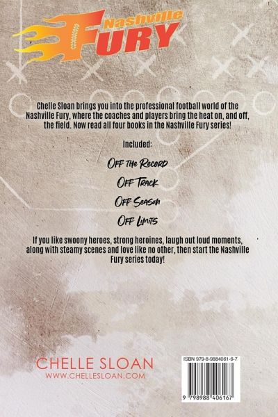 Chelle Sloan brings you into the professional football world of the Nashville Fury, where the coaches and players bring the heat on, and off, the field. This box set contains four full length stories. Off the Record My name is Sadie Benson and I committed the cardinal sin of being a female sports reporter: I fell in love with a coach. And with one panty-melting smile, Hunter McAvoy made me realize there is more to life than work. It was the story I never saw coming. We know that if our relationship becomes public, it could ruin everything we have spent our entire lives working for. It's a chance we're both willing to take. Off Track First comes love, then comes marriage, then comes the baby carriage. That's how it's supposed to go. Here's my version. First comes the blind date with an incredibly sexy football coach. Then comes the friends with benefits that you know is so wrong but you don't care because it feels so right. Then comes the unexpected baby carriage. At least we got one in order. Off Season When you're at the top of professional football, the fall to the bottom is steep. One minute I'm the face of the franchise. Next thing I know I'm being sent away after my self destructive ways have become too much to handle. Little does my team know that sending me back to my hometown is the worst thing they could have done. She's here. The one who broke me. The one who sent me to rock bottom. She's also the only one who can put me back together. Off Limits Professional football has an actual rulebook, but it's the unwritten rules that come with the harshest consequences. The biggest one of all: don't date your teammate's sister. And if you do, don't you dare fall in love with her.