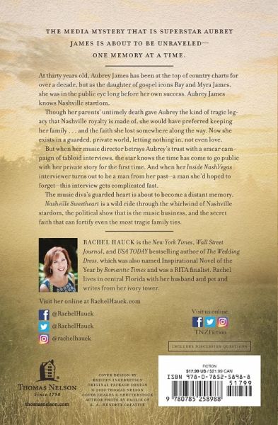 Aubrey can't outrun her past any longer... It's at her door, and the cameras are rolling. Aubrey James ruled the charts as the queen of country for over a decade. She'd rocketed to fame in the shadow of her parents' death-both of them pioneers in Gospel music. But while her public life, high profile romances, and fights with Music Row execs made for juicy tabloid headlines, the real and private Aubrey has remained a media mystery. When a former band member betrays Aubrey's trust and sells an "exclusive" to a tabloid, the star knows she must go public with her story. But Aubrey's private world is rocked when the Inside NashVegas interviewer is someone from her past-someone she'd hoped to forget. All the moxie in the world won't let her run any longer. * Sweet and thoughtful contemporary read * Book 1: Nashville Dreams; Book 2: Nashville Sweetheart * Book length: approximately 80,000 words * Includes discussion questions for book clubs *Nashville Sweetheart was originally published as Diva NashVegas.