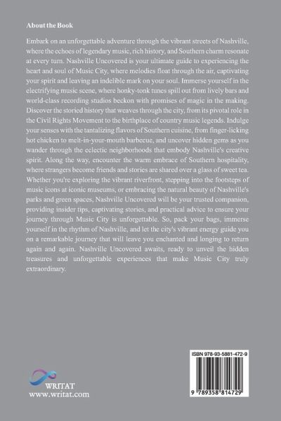 Embark on an unforgettable adventure through the vibrant streets of Nashville, where the echoes of legendary music, rich history, and Southern charm resonate at every turn. Nashville Uncovered is your ultimate guide to experiencing the heart and soul of Music City, where melodies float through the air, captivating your spirit and leaving an indelible mark on your soul. Immerse yourself in the electrifying music scene, where honky-tonk tunes spill out from lively bars and world-class recording studios beckon with promises of magic in the making. Discover the storied history that weaves through the city, from its pivotal role in the Civil Rights Movement to the birthplace of country music legends. Indulge your senses with the tantalizing flavors of Southern cuisine, from finger-licking hot chicken to melt-in-your-mouth barbecue, and uncover hidden gems as you wander through the eclectic neighborhoods that embody Nashville's creative spirit. Along the way, encounter the warm embrace of Southern hospitality, where strangers become friends and stories are shared over a glass of sweet tea. Whether you're exploring the vibrant riverfront, stepping into the footsteps of music icons at iconic museums, or embracing the natural beauty of Nashville's parks and green spaces, Nashville Uncovered will be your trusted companion, providing insider tips, captivating stories, and practical advice to ensure your journey through Music City is unforgettable. So, pack your bags, immerse yourself in the rhythm of Nashville, and let the city's vibrant energy guide you on a remarkable journey that will leave you enchanted and longing to return again and again. Nashville Uncovered awaits, ready to unveil the hidden treasures and unforgettable experiences that make Music City truly extraordinary.