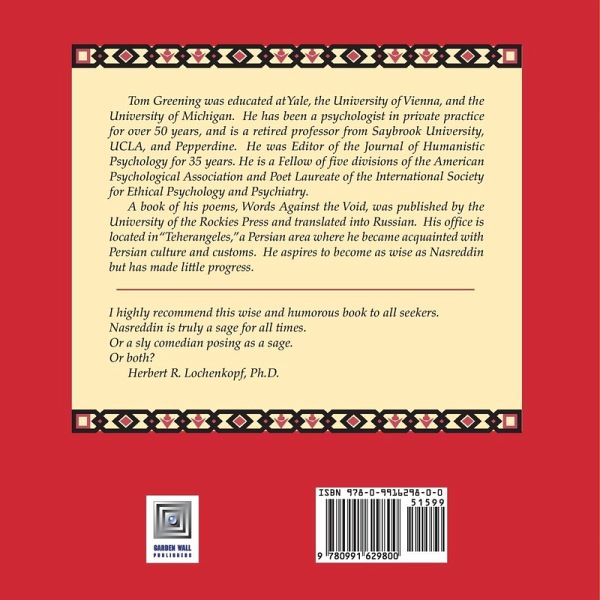 This delightful, whimsical, and often profound book depicts the legendary wise fool Nasreddin as a modern psychologist dispensing astute and ludicrous advice to gullible seekers. The exquisite illustrations come from the hand of Idaho artist Linda Hawkins. Nasreddin Hoca or Nastradin Hoxha or Nastradini is a 13th Century historical figure of philosophy and humorous story telling. He is claimed by many cultures and ethnic groups but he is especially associated with Turkey. Each summer the "International Nasreddin Hodja Festival" is held in Ak¿ehir, Turkey. Nasreddin is a teacher, savant, clown, jester, Zen master, guru, fool. He could be a cousin of Alfred E. Newman, whom you can visit in Mad Magazine, and Mark Twain, who wrote light-hearted commentary on human foibles. Although Nasreddin (with his faithful donkey) first lived, taught, and made a fool of himself and others many years ago, his spirit lives today. He has come back to us because he sees how badly we need his idiot wisdom. He has become a psychotherapist, an ominous threat to troubled seekers, an embarrassment to the profession, and perhaps a source of unexpected enlightenment.
