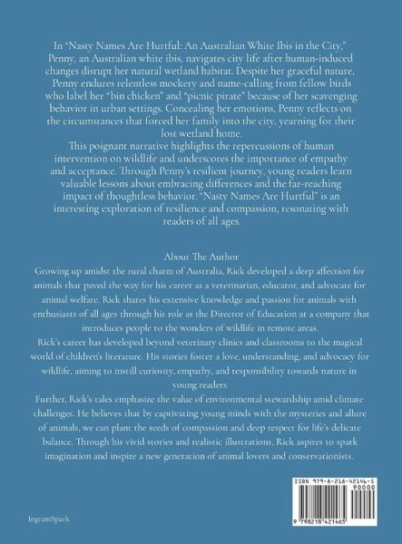 In "Nasty Names Are Hurtful: An Australian White Ibis Responds to Name-Calling in the City," meet Penny, an Australian white ibis navigating city life after human-induced changes disrupt her natural wetland habitat. Despite her graceful nature, Penny faces relentless mockery and name-calling from fellow birds who label her "bin chicken" and "picnic pirate" due to her scavenging behavior in urban settings. Enduring this hurtful ridicule, Penny conceals her emotions while reflecting on the circumstances that forced her family into the cityscape, yearning for their lost wetland home. A poignant narrative that sheds light on the repercussions of human intervention on wildlife and underscores the value of empathy and acceptance. Through Penny's resilient journey, young readers learn valuable lessons on embracing differences and the far-reaching impact of thoughtless behavior. "Nasty Names Are Hurtful" serves as a compelling exploration of resilience and compassion, resonating with readers of all ages.