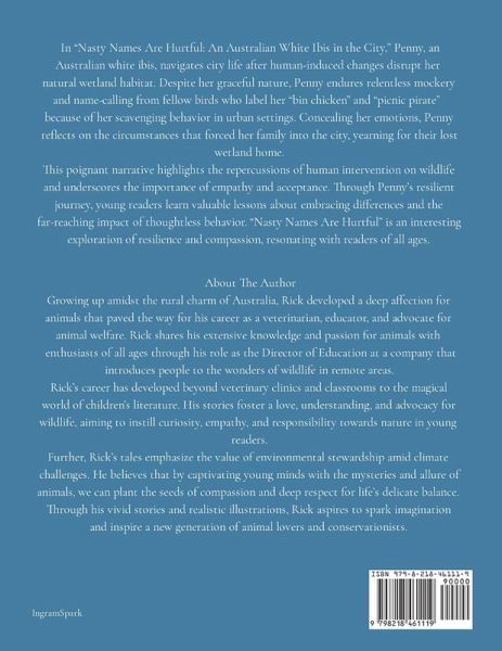 In "Nasty Names Are Hurtful: An Australian White Ibis Responds to Name-Calling in the City," meet Penny, an Australian white ibis navigating city life after human-induced changes disrupt her natural wetland habitat. Despite her graceful nature, Penny faces relentless mockery and name-calling from fellow birds who label her "bin chicken" and "picnic pirate" due to her scavenging behavior in urban settings. Enduring this hurtful ridicule, Penny conceals her emotions while reflecting on the circumstances that forced her family into the cityscape, yearning for their lost wetland home. A poignant narrative that sheds light on the repercussions of human intervention on wildlife and underscores the value of empathy and acceptance. Through Penny's resilient journey, young readers learn valuable lessons on embracing differences and the far-reaching impact of thoughtless behavior. "Nasty Names Are Hurtful" serves as a compelling exploration of resilience and compassion, resonating with readers of all ages.