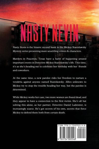 Nasty Nevin is the bizarre second book in the Mickey Stanislawsky Mystery series presenting more unsettling crimes & characters. Murders in Peaceton, Texas have a habit of happening around important events in Detective Mickey Stanislawsky's life. This time, it's as she's heading out to celebrate her birthday with her friends and coworkers. At the same time, a new parolee risks her freedom to nurture a vendetta against anyone named Stanislawsky. Allies unknown to Mickey try to stop the trouble heading her way, but the parolee is determined. While Mickey works her case, two more women are found dead, and they appear to have a connection to the first victim. She's all but solving this alone, as her partner, Detective Daniel Ladenster, is increasingly scarce. He's got secrets of his own, secrets that force Mickey to defend them both from certain death.