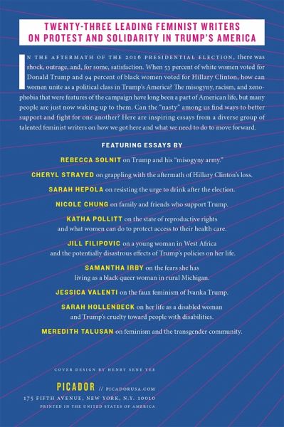 Twenty-Three Leading Feminist Writers on Protest and Solidarity When 53 percent of white women voted for Donald Trump and 94 percent of black women voted for Hillary Clinton, how can women unite in Trump's America? Nasty Women includes inspiring essays from a diverse group of talented women writers who seek to provide a broad look at how we got here and what we need to do to move forward. Featuring essays by REBECCA SOLNIT on Trump and his "misogyny army," CHERYL STRAYED on grappling with the aftermath of Hillary Clinton's loss, SARAH HEPOLA on resisting the urge to drink after the election, NICOLE CHUNG on family and friends who support Trump, KATHA POLLITT on the state of reproductive rights and what we do next, JILL FILIPOVIC on Trump's policies and the life of a young woman in West Africa, SAMANTHA IRBY on racism and living as a queer black woman in rural America, RANDA JARRAR on traveling across the country as a queer Muslim American, SARAH HOLLENBECK on Trump's cruelty toward the disabled, MEREDITH TALUSAN on feminism and the transgender community, and SARAH JAFFE on the labor movement and active and effective resistance, among others.