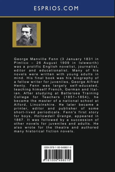 George Manville Fenn (3 January 1831 in Pimlico - 26 August 1909 in Isleworth) was a prolific English novelist, journalist, editor and educationalist. Many of his novels were written with young adults in mind. His final book was his biography of a fellow writer for juveniles, George Alfred Henty. Fenn was largely self-educated, teaching himself French, German and Italian. After studying at Battersea Training College for Teachers (1851-1854), he became the master of a national school at Alford, Lincolnshire. He later became a printer, editor and publisher of some short-lived periodicals. Fenn's first story for boys, Hollowdell Grange, appeared in 1867. It was followed by a succession of other novels for juveniles and adults. He also wrote for the theatre and authored many historical fiction novels.