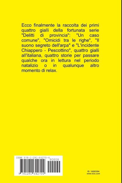 Ecco finalmente la raccolta dei primi quattro gialli della fortunata serie "Delitti di provincia": "Un caso comune", "Omicidi tra le righe", "Il suono segreto dell'arpa" e "L'incidente Chiappero - Pescottino", quattro gialli all'italiana, quattro storie per passare qualche ora in lettura nel periodo natalizio o in qualunque altro momento di relax.