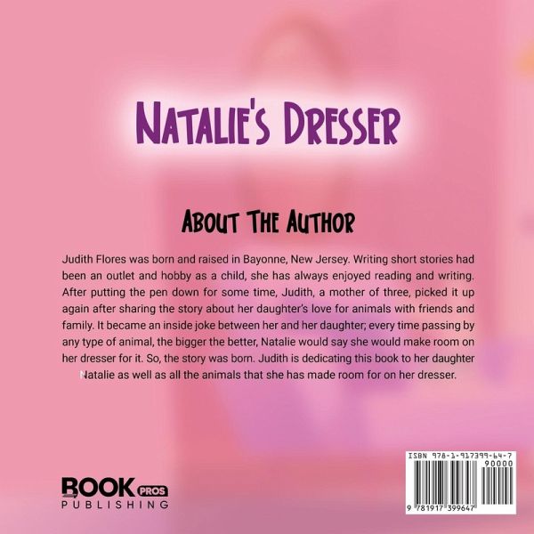 Judith Flores was born and raised in Bayonne, New Jersey. Writing short stories had been an outlet and hobby as a child, she has always enjoyed reading and writing. After putting the pen down for some time, Judith, a mother of three, picked it up again after sharing the story about her daughter's love for animals with friends and family. It became an inside joke between her and her daughter; every time passing by any type of animal, the bigger the better, Natalie would say she would make room on her dresser for it. So, the story was born. Judith is dedicating this book to her daughter Natalie as well as all the animals that she has made room for on her dresser.