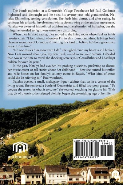 The bomb explosion at a Greenwich Village Townhouse left Paul Goldman frightened and distraught and he visits his seventy-year- old grandmother, Natalya Rhinerling, seeking consolation. She feeds him dinner, and after eating, he confesses his unlawful involvement with a violent wing of the antiwar movement. Natalya was aware of his political activism and the alienation of his father, but the things he revealed tonight were extremely disturbing. When they finished eating, they moved to the living room where Paul sat in his favorite chair. "I feel relaxed whenever I'm in this room, Grandma. It brings back pleasant memories of Grandpa Rhinerling. It's hard to believe he's been gone three years. I miss him." "No one misses him more than I do," she sighed, "and my heart is still broken. Now I am worried about you, my dear Paul, -and so are your parents. I decided that now is the time to reveal the shocking secrets your Grandfather and I had kept hidden for over 20 years." In the past, Natalya had avoided his probing questions, preferring to discuss her music career or tell stories about her childhood -how she hunted butterflies and rode horses on her family's country estate in Russia. "What kind of secrets could she be referring to?" Paul wondered. Natalya opened a small, mahogany liquor cabinet that sat in a corner of the living room. She removed a bottle of Courvoisier and filled two pony glasses. "To prepare the senses for what is to come," she toasted, touching her glass to his. With that bit of theatrics, the talented violinist began the astonishing saga of her life.