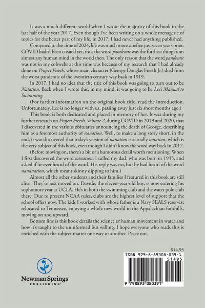 It was a much different world when I wrote the majority of this book in the last half of the year 2017. Even though I've been writing on a whole menagerie of topics for the better part of my life, in 2017, I had never had anything published. Compared to this time of 2024, life was much more carefree just seven years prior. COVID hadn't been created yet, thus the word pandemic was the furthest thing from almost any human mind in the world then. The only reason that the word pandemic was not in my cobwebs at this time was because of my research that I had already done on Project Freeth, whose main character (George Douglas Freeth Jr.) died from the worst pandemic of the twentieth century way back in 1919. In 2017, I had no idea that the title of this book was going to turn out to be Natation. Back when I wrote this, in my mind, it was going to be Lee's Manual to Swimming. (For further information on the original book title, read the introduction. Unfortunately, Lee is no longer with us, passing away just six short months ago.) This book is both dedicated and placed in memory of her. It was during my further research on Project Freeth, Volume 2, during COVID in 2019 and 2020, that I discovered in the various obituaries announcing the death of George, describing him as a foremost authority of nanation. Well, to make a long story short, in the end, it was discovered that today's version of nanation is actually natation, which is the very subject of this book, even though I didn't know the word way back in 2017. (Before moving on, there's a bit of a humorous detail worth mentioning. When I first discovered the word nanation, I called my dad, who was born in 1935, and asked if he ever heard of the word. His reply was no, but he had heard of the word nananation, which meant skinny dipping to him.) Almost all the other students and their families I featured in this book are still alive. They've just moved on. Davide, the eleven-year-old boy, is now entering his sophomore year at UCLA. He's in both the swimming club and the water polo club there. Due to present NCAA rules, clubs are the highest level of support that the school offers now. The kids I worked with whose father is a Navy SEALS reservist relocated to Tennessee, enjoying a whole new world in the Appalachian foothills, moving on and upward. Bottom line is this book details the science of human movement in water and how it's taught to the uninformed but willing. I hope everyone who reads this is enriched with the subject matter one way or another. Peace out.