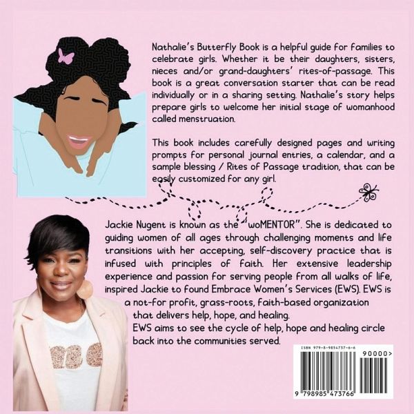 Nathalie's Butterfly Book is a helpful guide for families to celebrate girls. Whether it be their daughters, sisters, nieces and/or grand-daughters' rites-of-passage. This book is a great conversation starter that can be read individually or in a sharing setting. Nathalie's story helps prepare girls to welcome her initial stage of womanhood called menstruation. This book includes carefully designed pages and writing prompts for personal journal entries, a calendar, and a sample blessing / Rites of Passage tradition, that can be easily customized for any girl.
