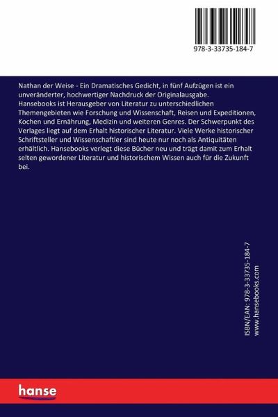Nathan der Weise - Ein Dramatisches Gedicht, in fünf Aufzügen ist ein unveränderter, hochwertiger Nachdruck der Originalausgabe.