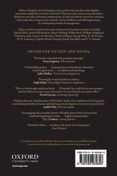 Patrick Parrinder's new history of the English novel from its beginnings to the present day traces the form's distinctive and often subversive reflection of national identity across the centuries. From the early stories of rogues and criminals to present-day novels of immigration, fiction has played a major part in defining our ideas of England and Englishness. Nation and Novel provides both a comprehensive survey and also a new interpretation of the importance of the English novel.Patrick Parrinder traces English prose fiction from its late medieval origins through its stories of rogues and criminals, family rebellions and suffering heroines, to the contemporary novels of immigration. He provides both a comprehensive survey and a new interpretation of the importance of the English novel.