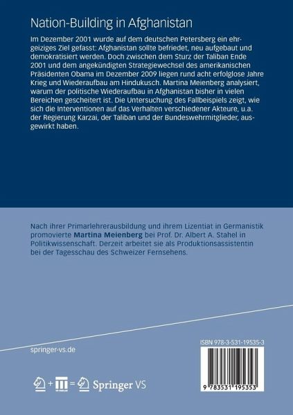 Im Dezember 2001 wurde auf dem deutschen Petersberg ein ehrgeiziges Ziel gefasst: Afghanistan sollte befriedet, neu aufgebaut und demokratisiert werden. Doch zwischen dem Sturz der Taliban Ende 2001 und dem angekündigten Strategiewechsel des amerikanischen Präsidenten Obama im Dezember 2009 liegen rund acht erfolglose Jahre Krieg und Wiederaufbau am Hindukusch. Martina Meienberg analysiert, warum der politische Wiederaufbau in Afghanistan bisher in vielen Bereichen gescheitert ist. Die Untersuchung des Fallbeispiels zeigt, wie sich die Interventionen auf das Verhalten verschiedener Akteure, u.a. der Regierung Karzai, der Taliban und der Bundeswehrmitglieder, ausgewirkt haben.