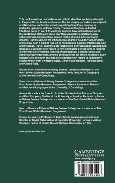 This book examines how national and ethnic identities are being reforged in the post-Soviet borderland states. The first chapter provides a conceptual and theoretical context for examining national identities, drawing in particular upon post-colonial theory. The rest of the book is divided into three parts. In Part I, the authors examine how national histories of the borderland states are being rewritten especially in relation to new nationalising historiographies, around myths of origin, homeland, and descent. Part II explores the ethnopolitics of group boundary construction and how such a politics has led to nationalising policies of both exclusion and inclusion. Part III examines the relationship between nation-building and language, especially with regard to how competing conceptions of national identity have informed the thinking of both political decision-takers and nationalising intellectuals, and the consequences for ethnic minorities. Such perspectives on nation-building are illustrated with substantive studies drawn from the Baltic states, Ukraine, and Belarus, Transcaucasia, and Central Asia.