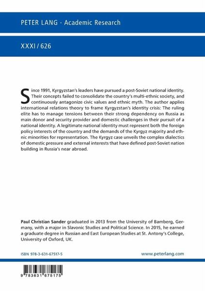 Since 1991, Kyrgyzstan's leaders have pursued a post-Soviet national identity. Their concepts failed to consolidate the country's multi-ethnic society, and continuously antagonize civic values and ethnic myth. The author applies international relations theory to frame Kyrgyzstan's identity crisis: The ruling elite has to manage tensions between their strong dependency on Russia as main donor and security provider and domestic challenges in their pursuit of a national identity. A legitimate national identity must represent both the foreign policy interests of the country and the demands of the Kyrgyz majority and ethnic minorities for representation. The Kyrgyz case unveils the complex dialectics of domestic pressure and external interests that have defined post-Soviet nation building in Russia's near abroad.