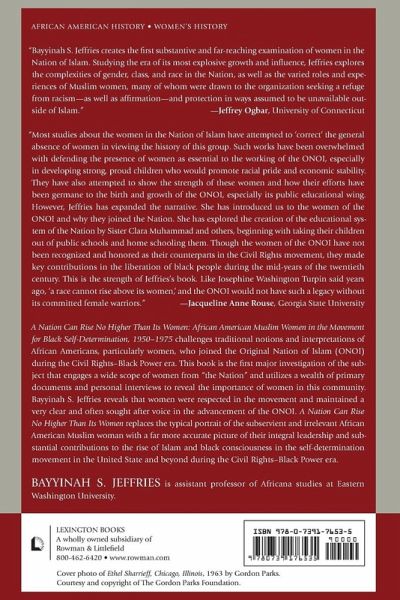 A Nation Can Rise No Higher Than Its Women: African American Muslim Women in the Nation of Islam, 1950–1975 challenges traditional interpretations of African American women who joined the Original Nation of Islam during the Civil Right-Black Power era. Using a wealth of academic research and firsthand accounts, Jeffries thoroughly debunks the popular opinion that women were not influential in the Nation of Islam, revealing instead that they were heralded in the movement. Women provided a clear, and often sought after voice in the advancement of not only the Nation, but the rise of Black pride and self-awareness during one of the most important periods of Black history in the United States.