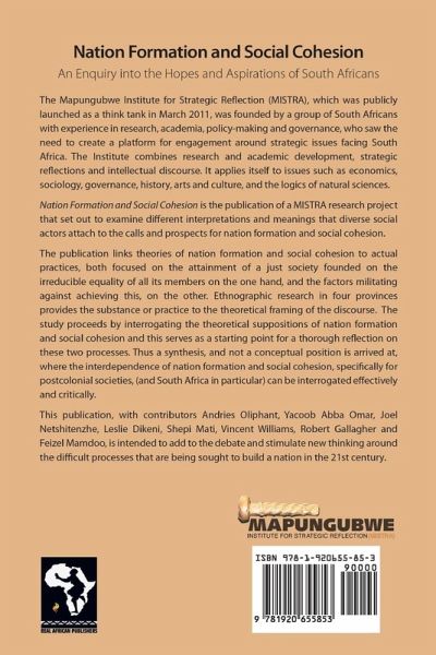 Nation Formation and Social Cohesion is the publication of a MISTRA research project that set out to examine different interpretations and meanings that diverse social actors attach to the calls and prospects for nation formation and social cohesion. The publication links theories of nation formation and social cohesion to actual practices, both focused on the attainment of a just society founded on the irreducible equality of all its members on the one hand, and the factors militating against achieving this, on the other. Ethnographic research in four provinces provides the substance or practice to the theoretical framing of the discourse. The study proceeds by interrogating the theoretical suppositions of nation formation and social cohesion and this serves as a starting point for a thorough reflection on these two processes. Thus a synthesis, and not a conceptual position is arrived at, where the interdependence of nation formation and social cohesion, specifically for postcolonial societies, (and South Africa in particular) can be interrogated effectively and critically. This publication, with contributors Andries Oliphant, Yacoob Abba Omar, Joel Netshitenzhe, Leslie Dikeni, Shepi Mati, Vincent Williams, Robert Gallagher and Feizel Mamdoo, is intended to add to the debate and stimulate new thinking around the diffcult processes that are being sought to build a nation in the 21st century.