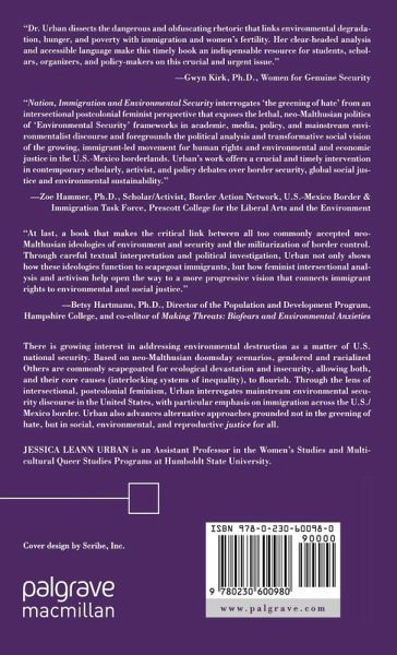 "At last a book that makes the critical link between all too commonly accepted neo-Malthusian ideologies of environment and security and the militarization of border control. Through careful textual interpretation and political investigation, Urban not only shows how these ideologies function to scapegoat immigrants, but how feminist intersectional analysis and activism help open the way to a more progressive vision that connects immigrant rights to environmental and social justice." - Betsy Hartmann, Ph.D., Director of the Population and Development Program, Hampshire College, and co-editor of Making Threats: Biofears and Environmental Anxieties