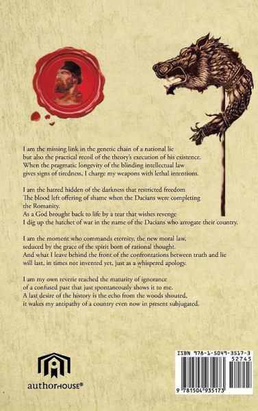 I am the missing link in the genetic chain of a national lie but also the practical recoil of the theory's execution of his existence. When the pragmatic longevity of the blinding intellectual law gives signs of tiredness, I charge my weapons with lethal intentions. I am the hatred hidden of the darkness that restricted freedom The blood left offering of shame when the Dacians were completing the Romanity. As a God brought back to life by a tear that wishes revenge I dig up the hatchet of war in the name of the Dacians who arrogate their country. I am the moment who commands eternity, the new…mehr