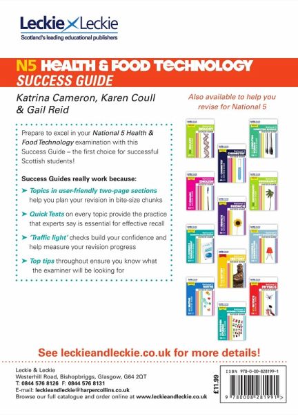 Exam Board: SQA Level: National 5 Subject: Health & Food Technology First Teaching: 2017, First Exam: 2018 National 5 Health & Food Technology Revision Guide provides easy-to-use and value-for-money revision for all abilities and learning styles, including guidance on the National 5 course and assessments structure. * Colourful double-page spreads aid both comprehensive and revision planning * Topics are broken down into small, easily managed sections, complemented with lots of diagrams and illustrations to aid retention * Quick Tests and Top Tips help keep students focused on the exam's precise demands * Revision checklists help students to manage and track their progress in the lead up to the exam * A glossary presents all of the key terms and definitions essential for the exam Formerly known as Leckie Success Guides - the number one revision brand in Scotland.