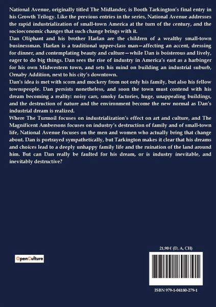 National Avenue, originally titled The Midlander, is Booth Tarkington¿s final entry in his Growth Trilogy. Like the previous entries in the series, National Avenue addresses the rapid industrialization of small-town America at the turn of the century, and the socioeconomic changes that such change brings with it. Dan Oliphant and his brother Harlan are the children of a wealthy small-town businessman. Harlan is a traditional upper-class man¿affecting an accent, dressing for dinner, and contemplating beauty and culture¿while Dan is boisterous and lively, eager to do big things. Dan sees the rise of industry in Americäs east as a harbinger for his own Midwestern town, and sets his mind on building an industrial suburb, Ornaby Addition, next to his city¿s downtown. Dan¿s idea is met with scorn and mockery from not only his family, but also his fellow townspeople. Dan persists nonetheless, and soon the town must contend with his dream becoming a reality: noisy cars, smoky factories, huge, unappealing buildings, and the destruction of nature and the environment become the new normal as Dan¿s industrial dream is realized. Where The Turmoil focuses on industrialization¿s effect on art and culture, and The Magnificent Ambersons focuses on industry¿s destruction of family and of small-town life, National Avenue focuses on the men and women who actually bring that change about. Dan is portrayed sympathetically, but Tarkington makes it clear that his dreams and choices lead to a deeply unhappy family life and the ruination of the land around him. But can Dan really be faulted for his dream, or is industry inevitable, and inevitably destructive?