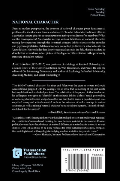 Seen in modern perspective, the concept of national character poses fundamental problems for social science theory and research: To what extent do conditions of life in a particular society give rise to certain patterns in the personalities of its members? What are the consequences? Alex Inkeles surveys various definitions of national character, tracing developments through the twentieth century. His approach is to examine the regularity of specific personality patterns among individuals in a society. He argues that modal personality may be extremely important in determining which new cultural elements are accepted and which institutional forms persist in a society. Reviewing previous studies, Inkeles canvasses the attitudes and psychological states of different nations in an effort to discover a set of values in the United States. He concludes that, despite recent advances in the field, there is much to be done before we can have a clear picture of the degree of differentiation in the personality structure of modern nations. Until now, there were few formal definitions and discussions on national character and the limits of this field of study. This book will be of great interest to psychologists, sociologists, philosophers, and political theorists.