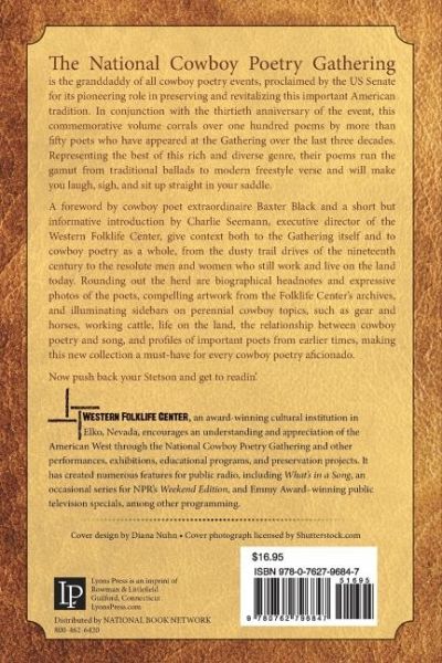 The National Cowboy Poetry Gathering is the granddaddy of all cowboy poetry events, proclaimed by the US Senate in 2000 in recognition of its pioneering role in the preservation and revitalization of this important American tradition. In conjunction with the 30th anniversary of the event, this commemorative volume collects 100 poems by various cowboy poets who have appeared at the gathering over the last three decades, from Baxter Black and Wallace McRae to Georgie Sicking and Paul Zarzyski. Representing the best contemporary cowboy poetry from the first gathering to the present, the poets and poems are culled for their importance and quality with consideration for a wide range of topics that represent the richness and depth of this broad genre. In addition to poems that will make you smile, sigh, or sit up straight in your saddle, the anthology features expressive photos of the contributors, biographical and explanatory headnotes, relevant artwork from the Western Folklife Center's extensive archives, and illuminating sidebars on various topics such as working cattle; life on the land; the relationship between cowboy poetry and song; gear, horses, or cattle mentioned in poems; and profiles and photos of important cowboy poets from earlier times. Cowboy poet extraordinare Baxter Black will provide a foreword, and Charlie Seemann, executive director of the Western Folklife Center, will write an introduction that gives context both to the event itself and to cowboy poetry in general, from the days of the trail drives in the nineteenth century to the lives of the hardworking men and women who still ranch and live on the land in the West today.