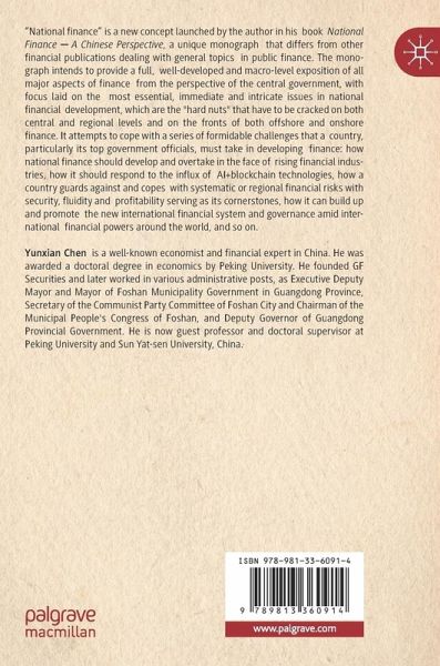 "National finance" is a new concept launched by the author in his book National Finance A Chinese Perspective, a unique monograph that differs from other financial publications dealing with general topics in public finance. The monograph intends to provide a full, well-developed and macro-level exposition of all major aspects of finance from the perspective of the central government, with focus laid on the most essential, immediate and intricate issues in national financial development, which are the "hard nuts" that have to be cracked on both central and regional levels and on the fronts of both offshore and onshore finance. It attempts to cope with a series of formidable challenges that a country, particularly its top government officials, must take in developing finance: how national finance should develop and overtake in the face of rising financial industries, how it should respond to the influx of AI+blockchain technologies, how a country guards against and copes with systematic or regional financial risks with security, fluidity and profitability serving as its cornerstones, how it can build up and promote the new international financial system and governance amid international financial powers around the world, and so on.