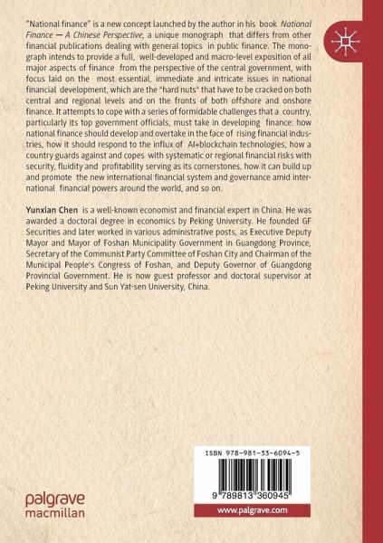 "National finance" is a new concept launched by the author in his book National Finance A Chinese Perspective, a unique monograph that differs from other financial publications dealing with general topics in public finance. The monograph intends to provide a full, well-developed and macro-level exposition of all major aspects of finance from the perspective of the central government, with focus laid on the most essential, immediate and intricate issues in national financial development, which are the "hard nuts" that have to be cracked on both central and regional levels and on the fronts of both offshore and onshore finance. It attempts to cope with a series of formidable challenges that a country, particularly its top government officials, must take in developing finance: how national finance should develop and overtake in the face of rising financial industries, how it should respond to the influx of AI+blockchain technologies, how a country guards against and copes with systematic or regional financial risks with security, fluidity and profitability serving as its cornerstones, how it can build up and promote the new international financial system and governance amid international financial powers around the world, and so on.