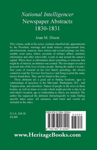 This volume, ninth in the series, contains classified ads, appointments by the President, marriage and death notices, congressional lists, advertisements, runaway slave notices and reward postings, tax lists, notable court cases, letters, accounts of military affairs, maritime information and other noteworthy events in and around the nation's capital. Where there is information about something or someone that might be of interest, an abstract was created. The newspaper reveals a personal side of the lives of many people. During the author's twenty-four years of research on her own family genealogy, she always wanted to read the National Intelligencer and bring to print the many stories found there. They can be found in this series. These abstracts are a great aid to finding locations, ages or relationships of ancestors in the Maryland, Washington, D.C., and Virginia areas, and elsewhere. Names of people in the news in these locales, as well as items or events which might provide a clue to an individual's location, age or relationship to others, are included. The author has organized the abstracts chronologically to make finding specific dates easier. All surnames, land tracts and vessels are included in the index.