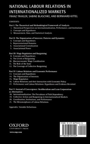 * Part One: The Theoretical and Methodological Framework of Analysis * 1: Theoretical Perspectives on Internationalization, Performance, and Institutions * 2: Concepts and Hypotheses * 3: Measurement, Data, and Statistical Analysis * Part Two: The Organization of Interests: Patterns and Dynamics * 4: Concepts and Hypotheses * 5: Representational Domains * 6: Associational Centralization * 7: Associational Power * Part Three: Wage Regulation and Bargaining * 8: Concepts and Hypotheses * 9: The Levels of BargainingNTOC * 10: Macroeconomic Wage Coordination * 11: The Role of the State * 12: The Coverage of Collective Bargaining * Part Four: Labour Relations and Economic Performance * 13: Concepts and Hypotheses * 14: The Organization of Interests * 15: Wage Regulation * 16: Labour Relations and their Interaction with Economic Policy * 17: Performance and Labour Relations: Hypotheses and Evidence Revisited * Part Five: Instead of Convergence: Neoliberalism and Lean Corporatism as Alternatives * 18: Internationalization, Performance, and the Prevalence of Path Dependency * 19: Collective Action and Bargaining in Internationalized Markets * 20: Coordination, Institutions, and Performance * 21: The Metamorphoses of Labour Relations