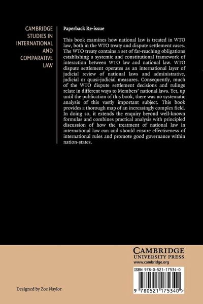 This book examines how national law is treated in WTO law, both in the WTO treaty and dispute settlement cases. The WTO treaty contains a set of far-reaching obligations establishing a systemic and constitutional framework of interaction between WTO law and national law. WTO dispute settlement operates as an international layer of judicial review of national laws and administrative, judicial or quasi-judicial measures. Consequently, much of the WTO dispute settlement decisions and rulings relate in different ways to Members' national laws. Yet, up until the publication of this book, there was no systematic analysis of this vastly important subject. This book provides a thorough map of an increasingly complex field. In doing so, it extends the enquiry beyond well-known formulas and combines practical analysis with principled discussion of how the treatment of national law in international law can and should ensure effectiveness of international rules and promote good governance within nation-states.