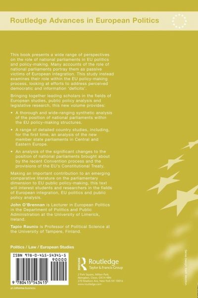 This book presents a wide range of perspectives on the role of national parliaments in EU politics and policy-making. Many accounts of the role of national parliaments portray them as passive victims of European integration. This study instead examines their role within the EU policy-making process, looking at efforts to address perceived democratic and information 'deficits'. Bringing together leading scholars in the fields of European studies, public policy analysis, and legislative research, this new volume provides: a thorough and wide-ranging synthetic analysis of the position of national parliaments within the EU policy-making structures a range of detailed country studies, including for the first time an analysis of the new member state parliaments in Central and Eastern Europe an analysis of the significant changes to the position of national parliaments brought about by the recent Convention process and the provisions of the EU's Constitutional Treaty. Making an important contribution to an emerging comparative literature on the parliamentary dimension to EU public policy-making, National Parliaments within the Enlarged European Union will interest students and researchers in the fields of European integration, EU politics, and public policy analysis.