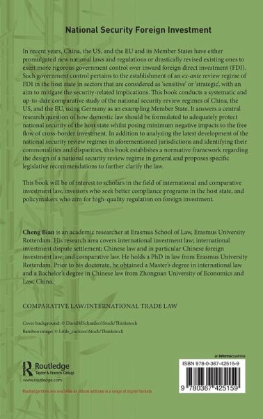Chapter 1 Introduction; PART I ESTABLISHING A NORMATIVE FRAMEWORK; Chapter 2 The conceptualization of national security; Chapter 3 The jurisprudential foundation of national security review of FDI; Chapter 4 A quest for theoretical principles establishing the national security review regime of FDI; PART II COUNTRY-SPECIFIC STUDIES; Chapter 5 The national security review regime of China; Chapter 6 The national security review regime of the US; Chapter 7 The national security review regime in the EU; PART III COMPARISON, CONCLUSIONS, AND RECOMMENDATIONS; Chapter 8 Revealing similarities and differences; Chapter 9 An evaluation to the comparative results; Chapter 10 Conclusions and policy recommendations;