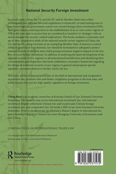 In recent years, China, the US, and the EU and its Member States have either promulgated new national laws and regulations or drastically revised existing ones to exert more rigorous government control over inward foreign direct investment (FDI). Such government control pertains to the establishment of an ex-ante review regime of FDI in the host state in sectors that are considered as 'sensitive' or 'strategic', with an aim to mitigate the security-related implications. This book conducts a systematic and up-to-date comparative study of the national security review regimes of China, the US, and the EU, using Germany as an exampling Member State. It answers a central research question of how domestic law should be formulated to adequately protect national security of the host state whilst posing minimum negative impacts to the free flow of cross-border investment. In addition to analyzing the latest development of the national security review regimes in aforementioned jurisdictions and identifying their commonalities and disparities, this book establishes a normative framework regarding the design of a national security review regime in general and proposes specific legislative recommendations to further clarify the law. This book will be of interest to scholars in the field of international and comparative investment law, investors who seek better compliance programs in the host state, and policymakers who aim for high-quality regulation on foreign investment.