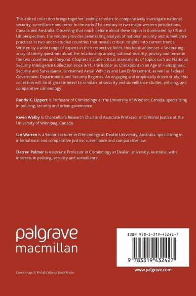 Chapter 1. Introduction.- Chapter 2. (Canada) - One Warrant to Rule Them All.- Chapter 3. (Australia) - Australian National Security Intelligrance Collection Since 9/11.- Chapter 4. (Canada) - The Supreme Court of Canada Presents.- Chapter 5. (Australia) - Assemblage, Counter-law and the Legal Architecture of Australian Covert Surveillance.- Chapter 6. (Australia) - The Australian Security Continuum.- Chapter 7. (Canada) - Securitizing 'National Interests'.- Chapter 8. (Australia) - The 'Security of Security'.- Chapter 9. (Canada) - Justifying Insecurity.- Chapter 10. (Australia/Canada) - Unmanned Aerial Vehicles (UAVs) and Law Enforcement in Australia.- Chapter 11. (Canada) - The Canada-US Shiprider Program, Jurisdiction and the Crime-Security Nexusa) - Surveillance and the Colonial Dream