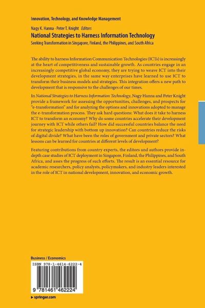 In National Strategies to Harness Information Technology, Nagy Hanna and Peter Knight provide a framework for assessing the opportunities, challenges, and prospects for "e-transformation" and for analyzing the options and innovations adopted to manage the e-transformation process. They ask hard questions: what does it take to harness ICT to transform an economy? Why some countries accelerate their development journey with ICT while others fail? How did successful countries balance the need for strategic leadership with bottom up innovation? Can countries reduce the risks of digital divide? What have been the roles of government and private sectors? What lessons can be learned for countries at different levels of development?