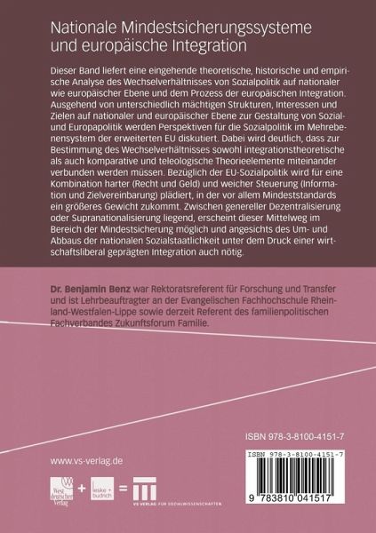 Das Buch untersucht Geschichte und Perspektiven des Verhältnisses von Sozialpolitik und der Integration sowie Erweiterung der Europäischen Union: Bleibt oder wird die Mindestsicherung (Sozialhilfe etc.) Kern oder Anhängsel des Europäischen Sozialmodells?
