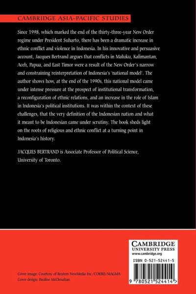Since 1998, which marked the end of the thirty-three-year New Order regime under President Suharto, there has been a dramatic increase in ethnic conflict and violence in Indonesia. In his innovative and persuasive account, Jacques Bertrand argues that conflicts in Maluku, Kalimantan, Aceh, Papua, and East Timur were a result of the New Order's narrow and constraining reinterpretation of Indonesia's 'national model'. The author shows how, at the end of the 1990s, this national model came under intense pressure at the prospect of institutional transformation, a reconfiguration of ethnic relations, and an increase in the role of Islam in Indonesia's political institutions. It was within the context of these challenges, that the very definition of the Indonesian nation and what it meant to be Indonesian came under scrutiny. The book sheds light on the roots of religious and ethnic conflict at a turning point in Indonesia's history.