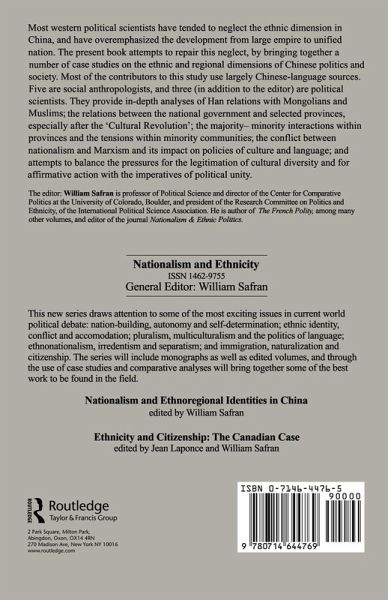 Chapter 1 Introduction: Nation Ethnie Region and Religion as Markers of Identity William Safran; Chapter 2 State Discourses Minority Policies and the Politics of Identity in the Lijiang Naxi People's Autonomous County SYDNEY D. WHITE; Chapter 3 Han-Muslim and Intra-Muslim Social Relations in Northwestern China COLIN MACKERRAS; Chapter 4 Language Education Intellectuals and Symbolic Representation: Being an Urban Mongolian in a New Configuration of Social Evolution NARAN BILIK; Chapter 5 The Texture of Tongues: Languages and Power in China ARIENNE M. DWYER; Chapter 6 Preferential Policies for Ethnic Minorities in China: The Case of Xinjiang BARRY SAUTMAN; Chapter 7 Ethnic Identity Change in the People's Republic of China: An Explanation Using Data from the 1982 and 1990 Census Enumerations MATTHEW HODDIE; Chapter 8 Unforgiven and Remembered: The Impact of Ethnic Conflicts in Everyday Muslim-Han Social Relations on Hainan Island KENG-FONG PANG; Chapter 9 Patriotic Viliams and Patriotic Heroes: Chinese Literary Nationalism in the 1990s YINGJIE GUO;