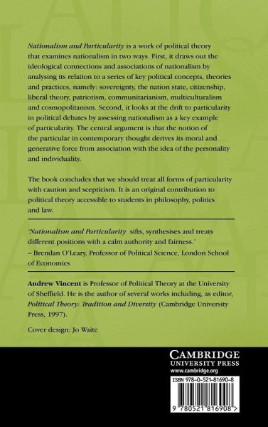 Nationalism and Particularity, first published in 2002, is a work of political theory that examines nationalism in two ways. Firstly it draws out the ideological connections and associations of nationalism by analysing its relation to a series of key political concepts, theories and practices: namely, sovereignty, the nation state, citizenship, liberal theory, patriotism, communitarianism, multiculturalism and cosmopolitanism. Second, it looks at the drift to particularity in political debates by assessing nationalism as a key example of particularity. The central argument is that the notion of the particular in contemporary thought derives its moral and generative force from association with the idea of the personality and individuality. The book concludes that we should treat all forms of particularity with caution and scepticism. It is an original contribution to political theory accessible to students in philosophy, politics and law.