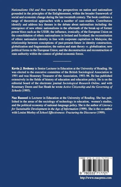 Notes on the Contributors Introduction; K.J.Brehony & N.Rassool Political Power and Territorial Form: The 'Nation' State in Theory; C.Collinge Transnationalism, 'postmodern' territorialities and democracy in the European Union; J.Anderson & J.Goodman 'The Time-Space of National Memory'; S.Allan & A.Thompson 'Ethnic Nationalism': Authenticity, Atavism and International Instability; S.Bowler Rethinking Nationalism in the Context of Globalization; R.Schroeder Blood and Sacrifice: Politics versus Culture in the Construction of Nationalism; P.Spencer & H.Wollman Envisioning the Malaysian Nation: Ethnic Nationalism or Corporate Capitalism?; S.Khoo Reconstructing Nationalism on the Celtic Frontier; P.G.Craig & I.A.Reid British Nationalism and the Northern Ireland 'Peace Process'; L.O'Dowd Time, Biography and Ethnic and National Identity Formation; B.Roberts Scotland and Europe: Three Visions and Contemporary Scottish Nationalism; A.Ichijo Nationalism, Culture and the end of Civilization?; N.Parry & J.Parry Index